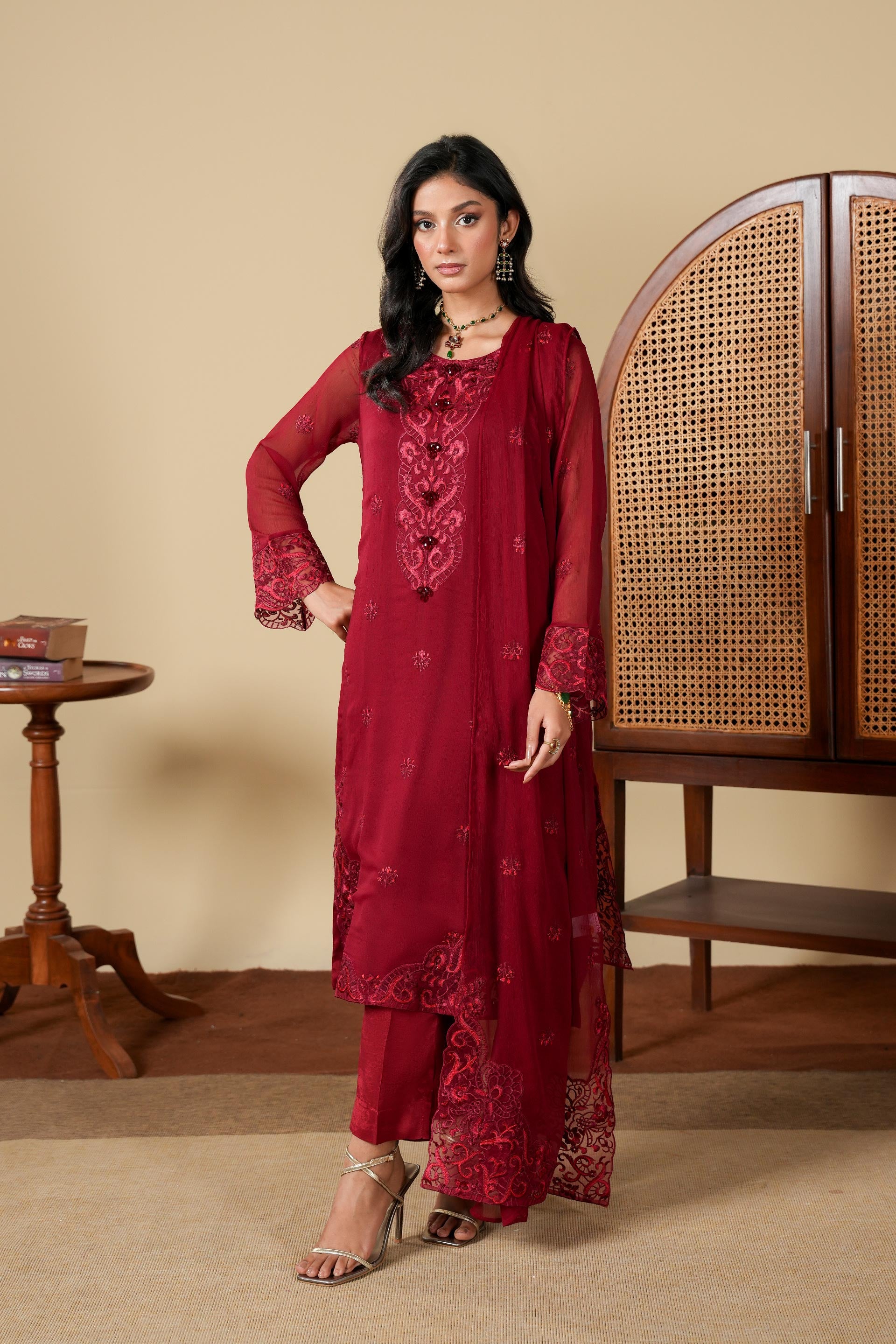 Experience elegance with the Suit in Maroon, crafted from premium Chiffon. This 3 Piece Suit is perfectly designed for any occasion.